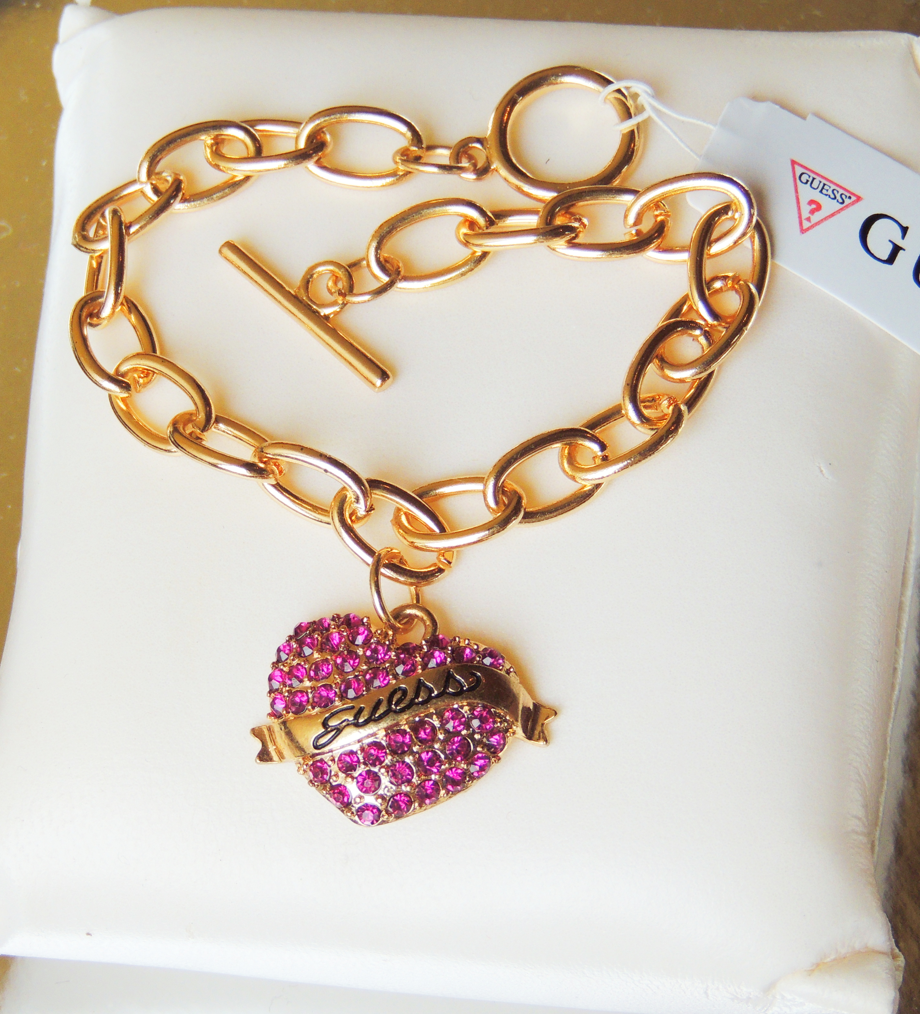 Náramek Guess srdíčko zlaté barvy s růžovými kamínky