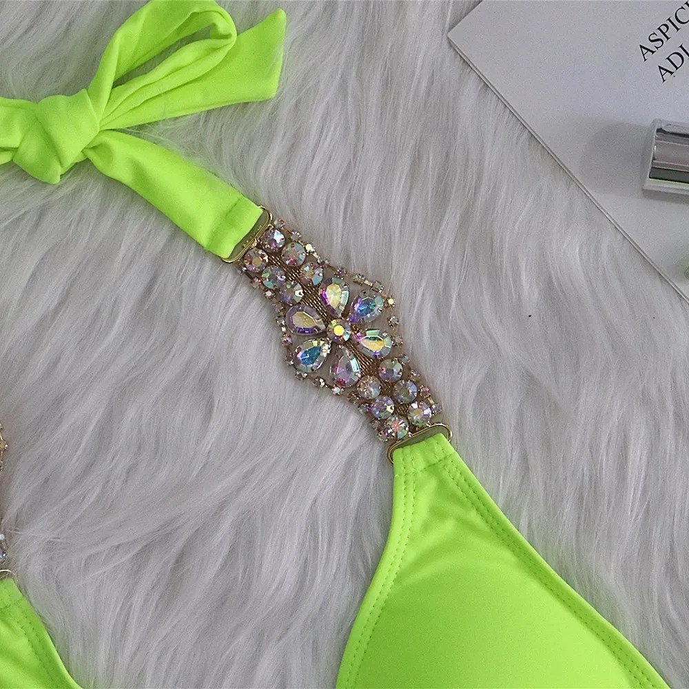 Dámské plavky neonově zelené barvy bikiny se šperky s kamínky