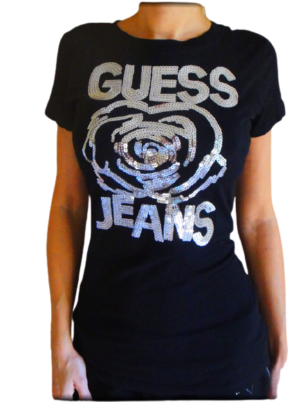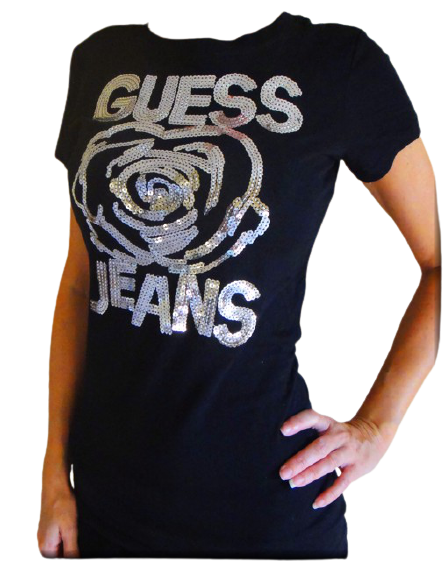 vepředu zdobené růžičkou a flitrovým nápisem Guess