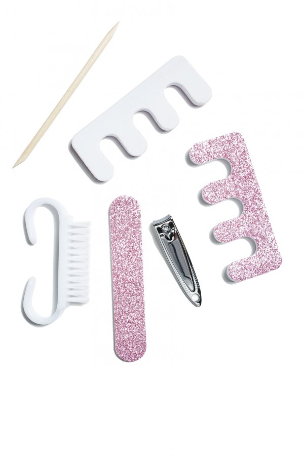 třpytivá růžová sada , pilníček, oddělovač prstíků, kartáček, cvakací kleštičky a dřívko