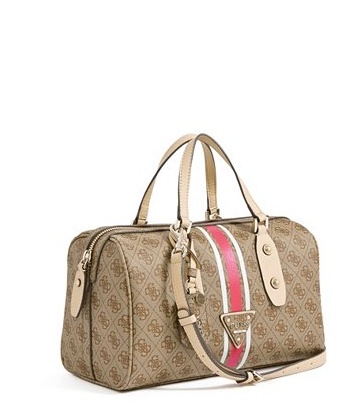 - Exteriér z umělé kůže s logy Guess a pruhy v červené a bílé barvě.