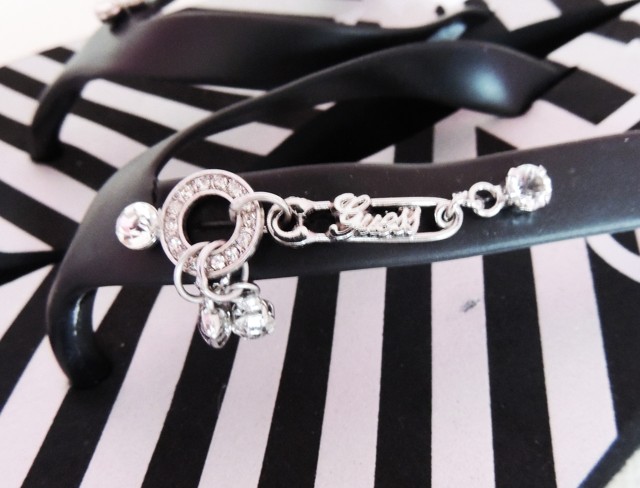pásky zdobené kovovými ozdobami s nápisy Guess s kamínky a přívěsky