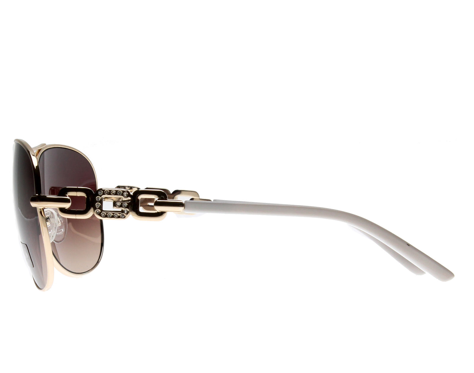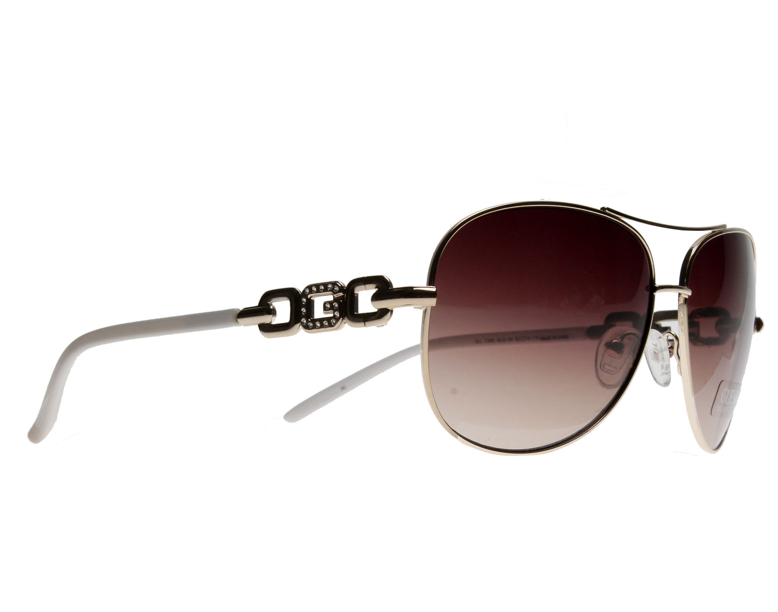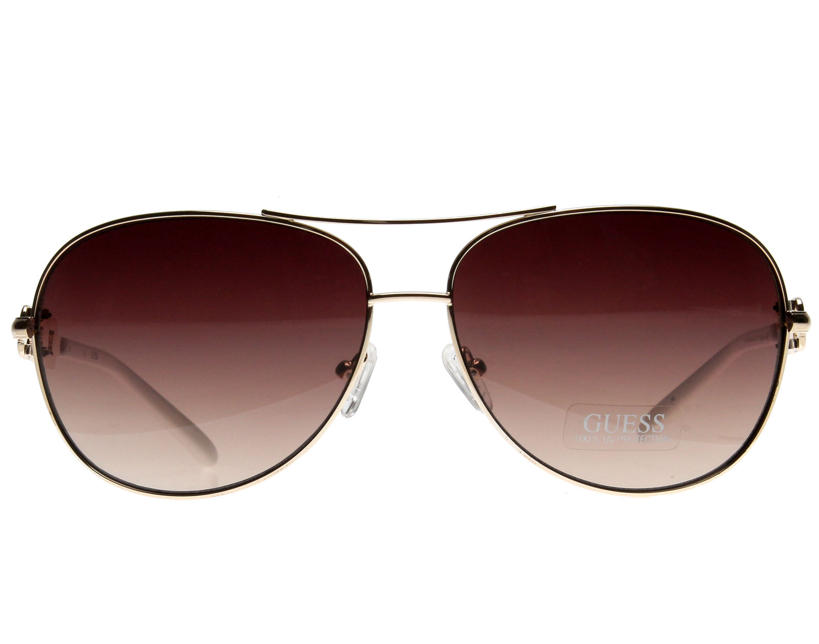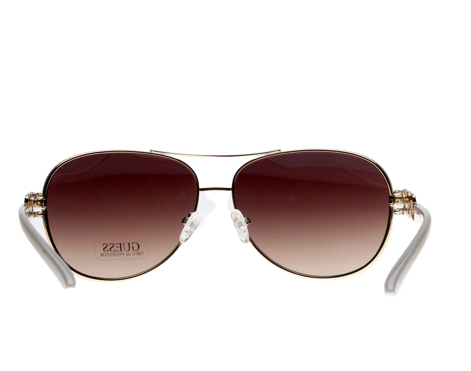 Sluneční brýle, které nikdy nevyjdou z módy - to jsou klasické a oblíbené pilotky. Tento model od značky Guess má obroučky světle zlaté barvy a spoustu jemných detailů. Stranice jsou stejně jako obruba zlaté barvy, zadní část doplněna bílým plastem pro pohodlné nošení. Na stranici je logo Guess. Gradientní tónová hnědá skla, nastavitelné nosní opěrky.